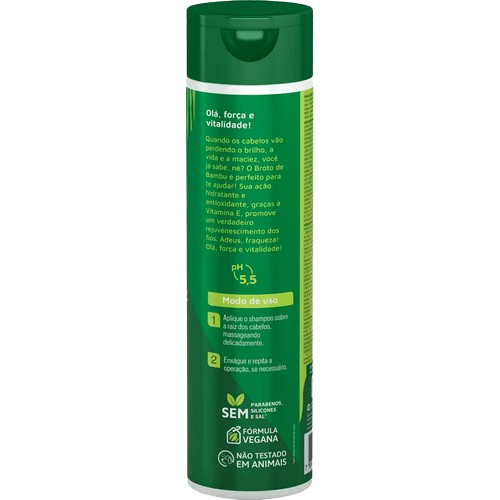El shampoo de la línea Broto de Bambu de Novex mantiene el equilibro natural en la piel cabelluda aportando fuerza y resistencia a cabellos débiles. Ideal para cabellos ondulados, rizados, muy rizados y crespos gruesos. Elaborado con ingredientes naturales como bambú para tratar cabellos frágiles y que presenten daños ayudando a reponer aminoácidos gracias al mineral de sílice y Vitamina E para difuminar pequeñas cicatrices y construir una barrera natural que protege la piel de rayos solares. pH 5.5. Producto cruelty free, no testado en animales.